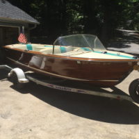 Very nice used 1953 Chris Craft 20 foot Special Sportsman. The boat is powered by a 158 HP Chris Craft MBL that has just been completely rebuilt. The boat was restored about twelve years ago. The interior is upholstered in a medium red naugahyde material with white piping, which is in nice condition. Varnish inside and out is in good condition. Standard equipment include, navigation lights with pole mounted stern light and flag, auto bailer in the stern, 900 GPH Lovett bilge pump in the forward bilge, ventilated motor box, deck mounted ventilating scoops,lifting eyes forward and aft, steering wheel mounted throttle and electric horn. Also included is a bow burgee pole with a Chris Craft pennant.Carriage for this vessel is by a `white painted steel single axle Shoreline trailer with good tires. Gauges include the original tachometer, oil pressure and ammeter. The bottom was fiberglassed.